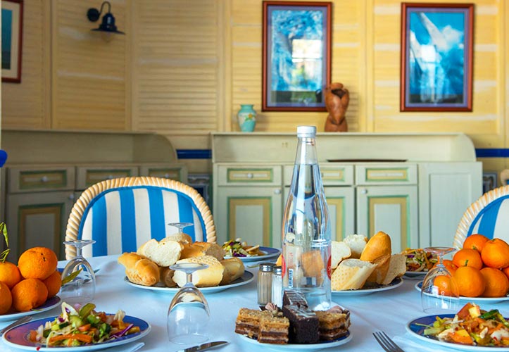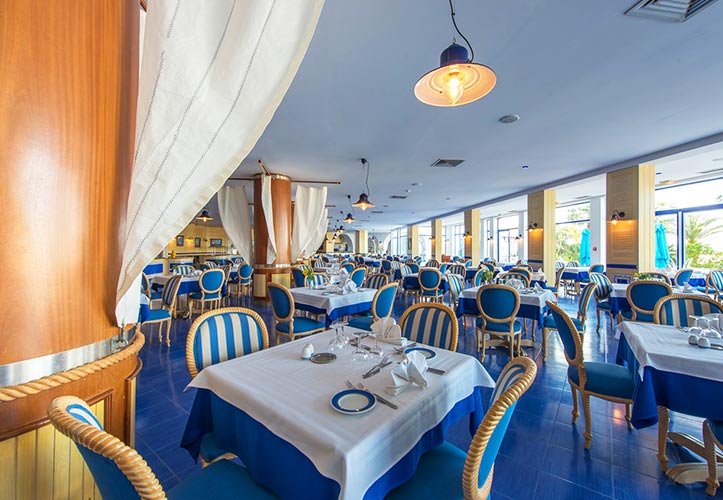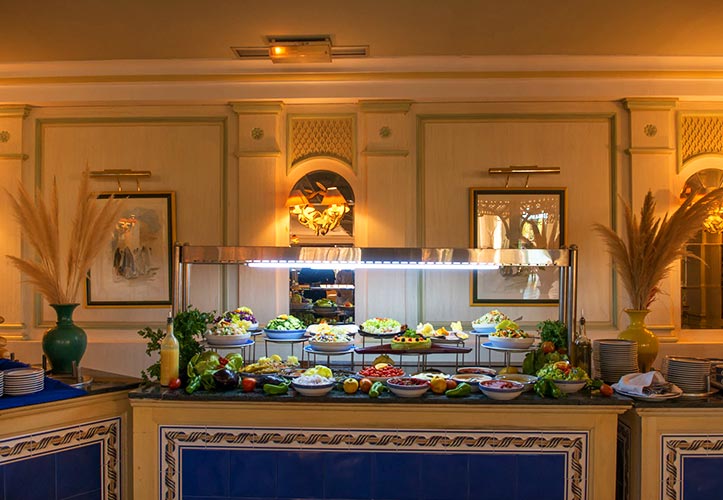 Restaurant Principal « La Voile » sous forme de buffet avec grande terrasse, cuisine internationale, spécialités tunisiennes et stand show-cooking.